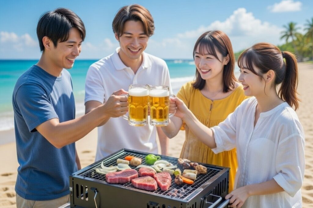 貸切ビーチでのバーベキューです。機材・食材をご用意しますので、手ぶらでOK!